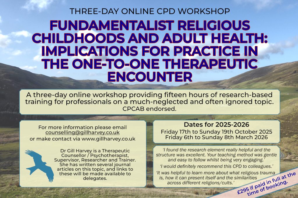 Three-day online workshops: Fundamentalist religious childhoods and adult heath: Implications for practice in the one-to-one therapeutic encounter